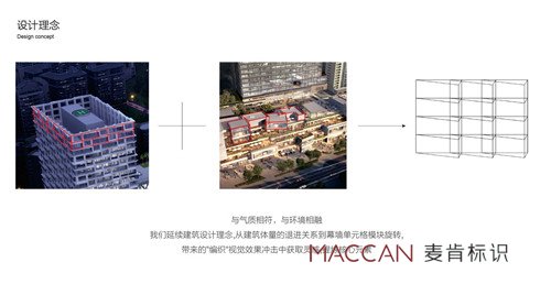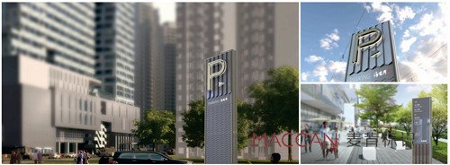 設(shè)計(jì)師通過簡練的線條和充滿創(chuàng)意的結(jié)構(gòu)創(chuàng)造,將建筑及景觀、空間的語言轉(zhuǎn)化到標(biāo)識系統(tǒng);用提煉的元素重疊旋轉(zhuǎn)及錯位關(guān)系反映在標(biāo)識牌上與氣質(zhì)相符, 與環(huán)境相融;麥肯延續(xù)海境界建筑設(shè)計(jì)理念,從建筑體量的退進(jìn)關(guān)系到幕墻單元格模塊旋轉(zhuǎn),帶來的"編織"視覺效果沖擊中獲取靈感,提煉核心元素,使其環(huán)境標(biāo)識牌與建筑遙相呼應(yīng),賦予來訪者一個關(guān)于頂級人居生活場所的絕佳審美期待 。