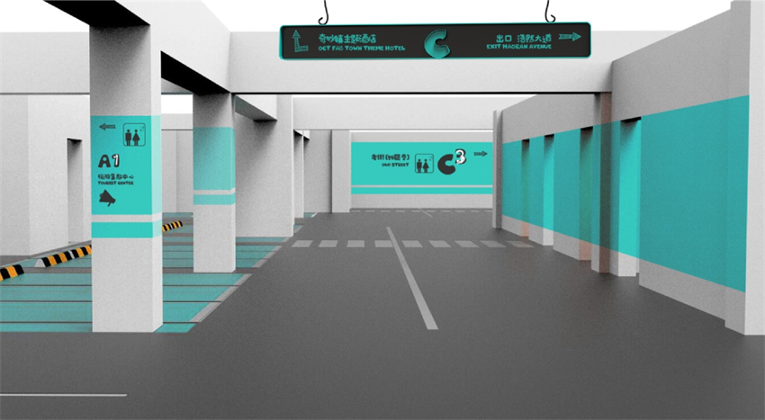地下停車場導(dǎo)視設(shè)計(jì)師使用較為鮮艷的色彩劃分樓層區(qū)域,結(jié)合品牌IP元素的圖像符號作為主要標(biāo)識元素,停車場入口栩栩如生的大型P標(biāo)識簡單大方。車位信息設(shè)置在高度可見的位置,便于記憶和尋找。其中色彩的運(yùn)用,不僅區(qū)分了空間區(qū)域,同時(shí)還營造了視覺張力,為游客帶來全新的體驗(yàn)。