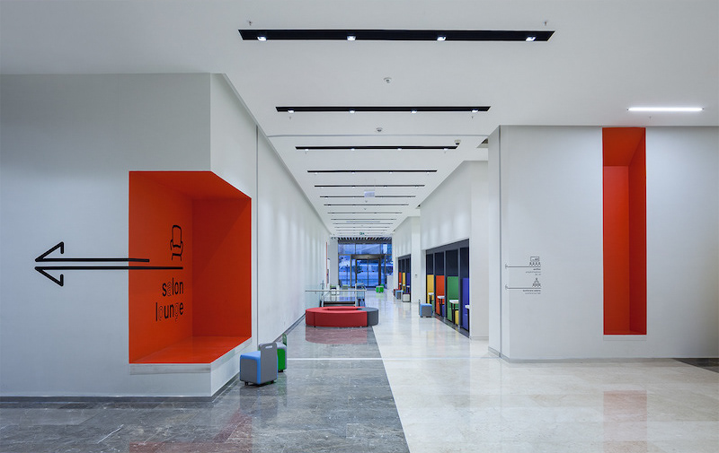 基于伊斯坦布爾大學(xué)文化校區(qū)內(nèi)部空間大,需要強有力的導(dǎo)視系統(tǒng),pompaa設(shè)計團隊采用較粗的字體,易于辨識。特別的是,將方向標(biāo)識和icon、編碼相結(jié)合,并延長了方向標(biāo)識,打破空間面,增強視覺沖擊力。主導(dǎo)視信息使用黑白配色,次級導(dǎo)視信息則使用豐富多彩的顏色進行區(qū)分,信息層次分明,增添了尋路的樂趣。