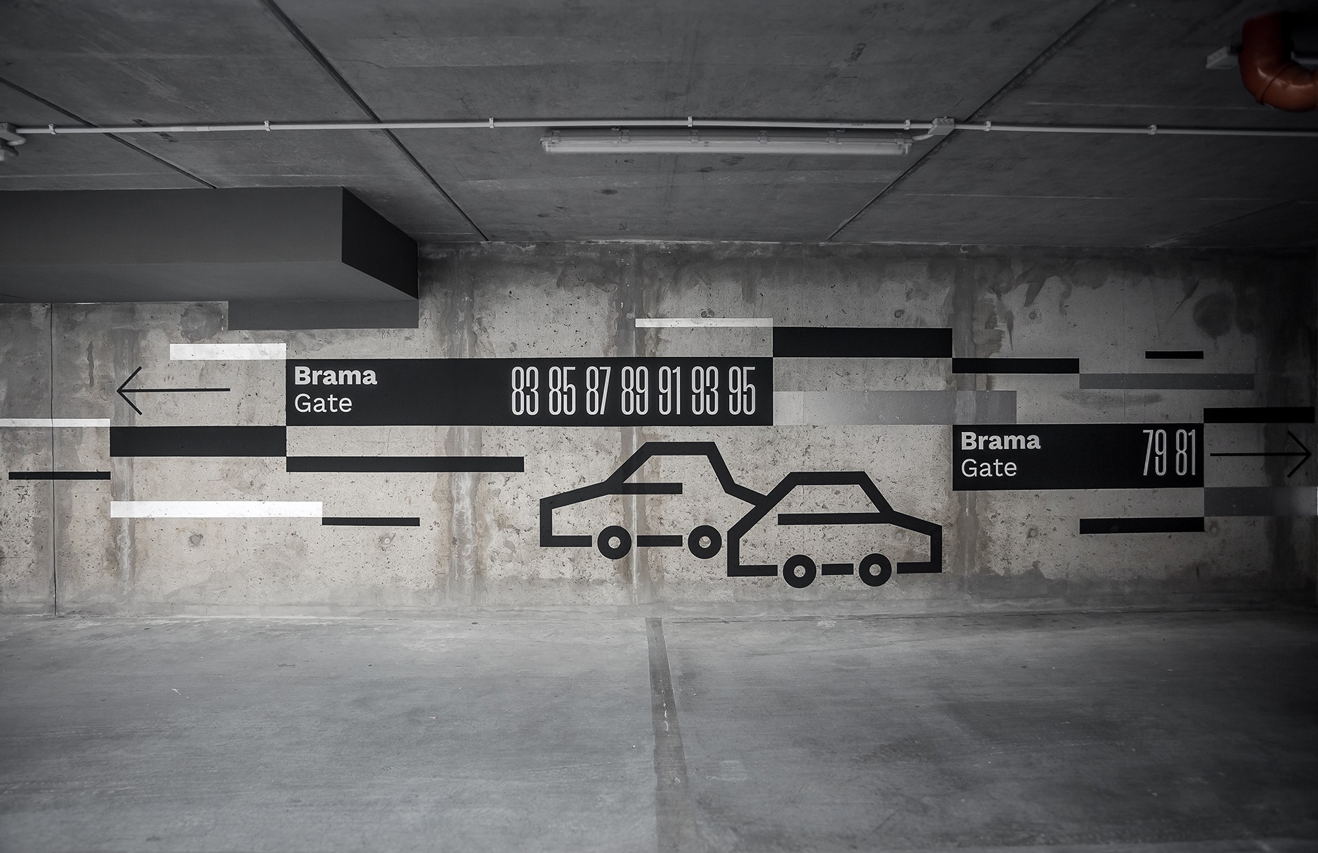 基于ARMII KRAJOWEJ 46A公寓的外觀,Kolektyf采用黑色和白色的配色,與內(nèi)飾相統(tǒng)一。字體設(shè)計纖長圓潤,在地庫設(shè)計了粗細不一的線條狀的環(huán)境圖形,為工業(yè)風空間增添活力,整套導視系統(tǒng)簡約高效。工業(yè)風的色彩特征,黑白調(diào),顯然是復古的特性展現(xiàn)。