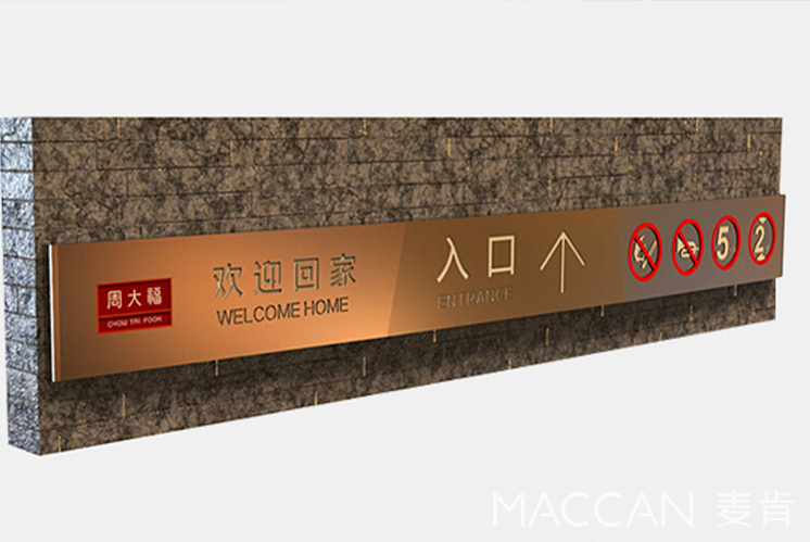 麥肯團(tuán)隊(duì)經(jīng)過(guò)多次的實(shí)地勘察和品牌分析,確定以簡(jiǎn)約、時(shí)尚為導(dǎo)視設(shè)計(jì)宗旨,并結(jié)合周大福品牌文化借以寶石、鉆石切割的概念,采用選定的工藝來(lái)實(shí)現(xiàn)這一效果,強(qiáng)調(diào)品質(zhì)及低調(diào)奢華之感,從而更加貼近集團(tuán)定位。麥肯設(shè)計(jì)方案的出發(fā)點(diǎn)注重與空間環(huán)境的緊密結(jié)合度,在簡(jiǎn)約的標(biāo)識(shí)設(shè)計(jì)靈感下,充分考慮周大福大廈空間的屬性和使用人群,并結(jié)合室內(nèi)裝飾特點(diǎn)進(jìn)行提取糅合,從而通過(guò)標(biāo)識(shí)設(shè)計(jì)更好地展現(xiàn)出環(huán)境空間的裝飾性以及集團(tuán)品牌系統(tǒng)的強(qiáng)大性和品質(zhì)感。