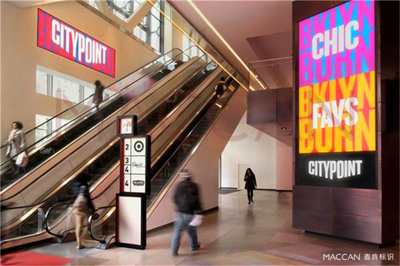 6、購物中心標識標牌設計的不同功能使得每種類型的標識標牌所處的環(huán)境不同。在相關地方,類似或類似的制導系統(tǒng)設計也可以用數(shù)字編碼來加深記憶。