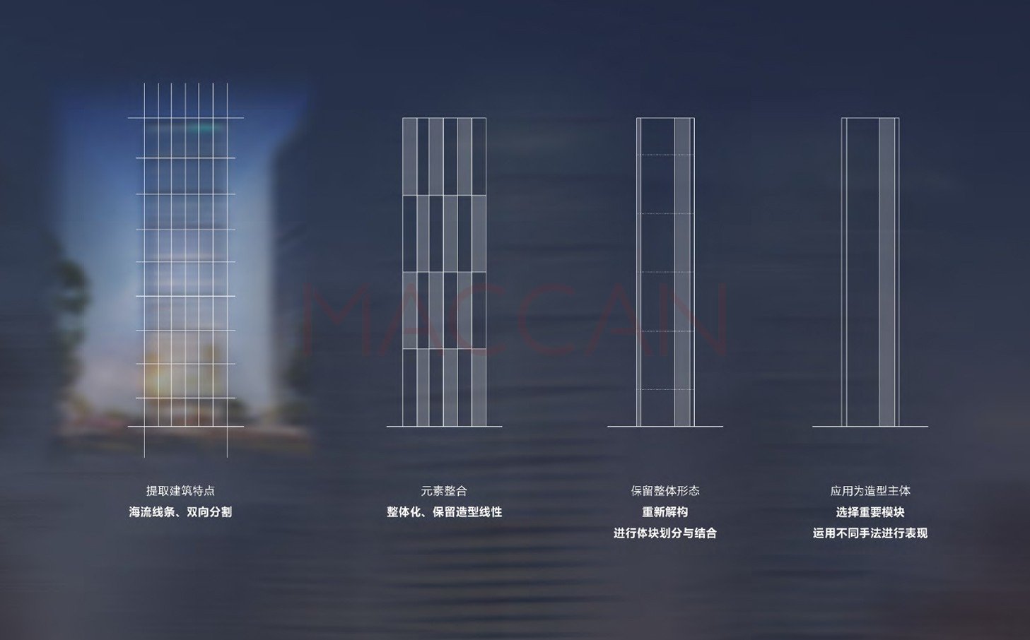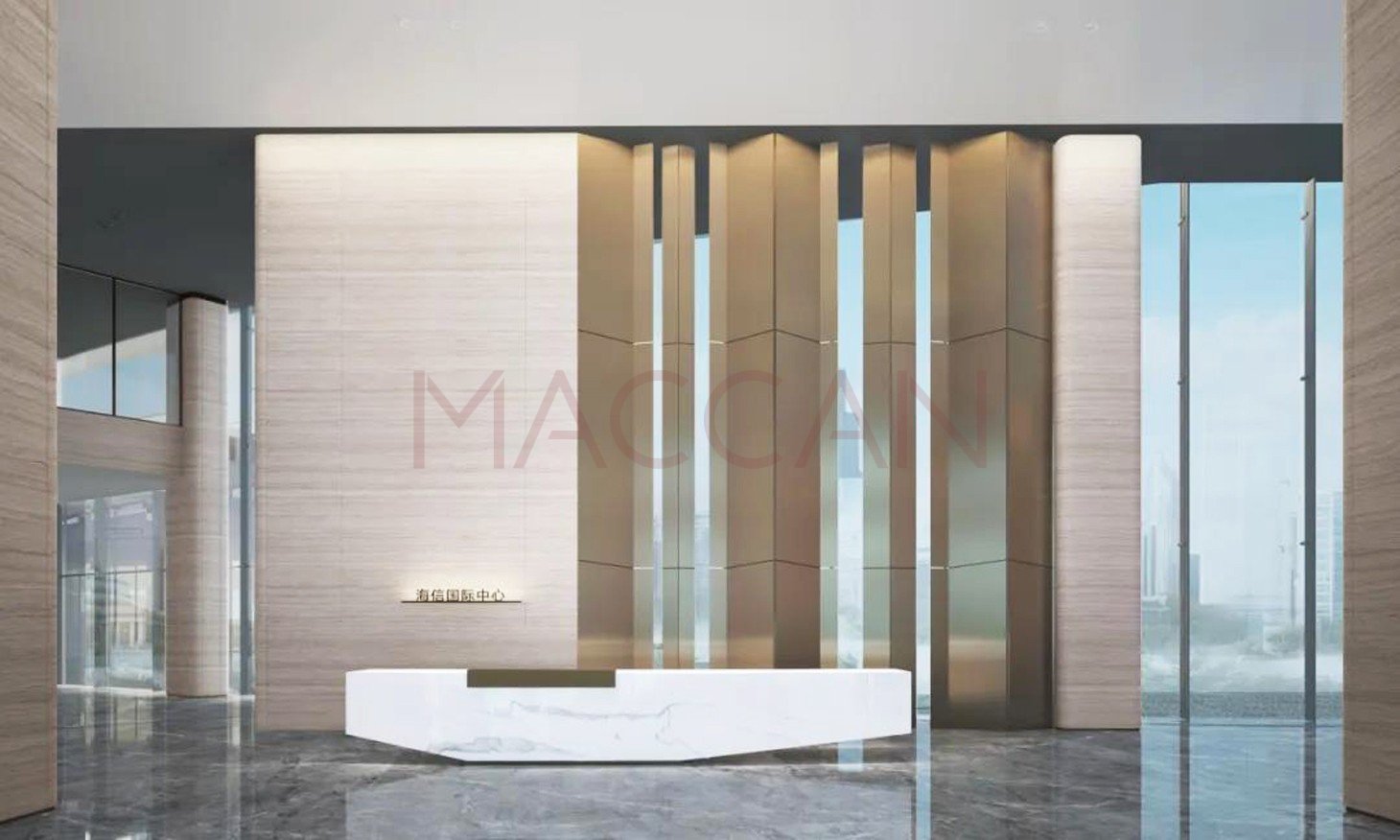 設(shè)計(jì)師從海信國際中心logo上獲得靈感,提取空間環(huán)境特點(diǎn),用海形線條、線性表達(dá),層次線條、線面結(jié)合,保留線性元素,增加流動感。